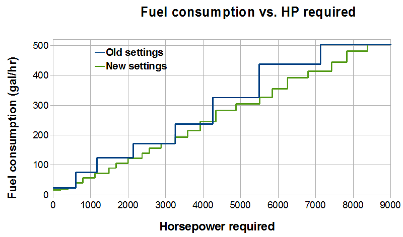 This new system would save fuel in two ways. One, it would avoid very inefficient configurations like 666 and 777. Two, more virtual “notches” make it possible to more closely match the desired power, and make fewer power setting changes. On the graph above, notice that the “old” and “new” settings coincide, from 400-600, 2880-3255, and 8375-9000 HP, where both methods have all units in notch 1, notch 4, and notch 8, respectively. Everywhere else, the new power settings provide substantially greater fuel efficiency.